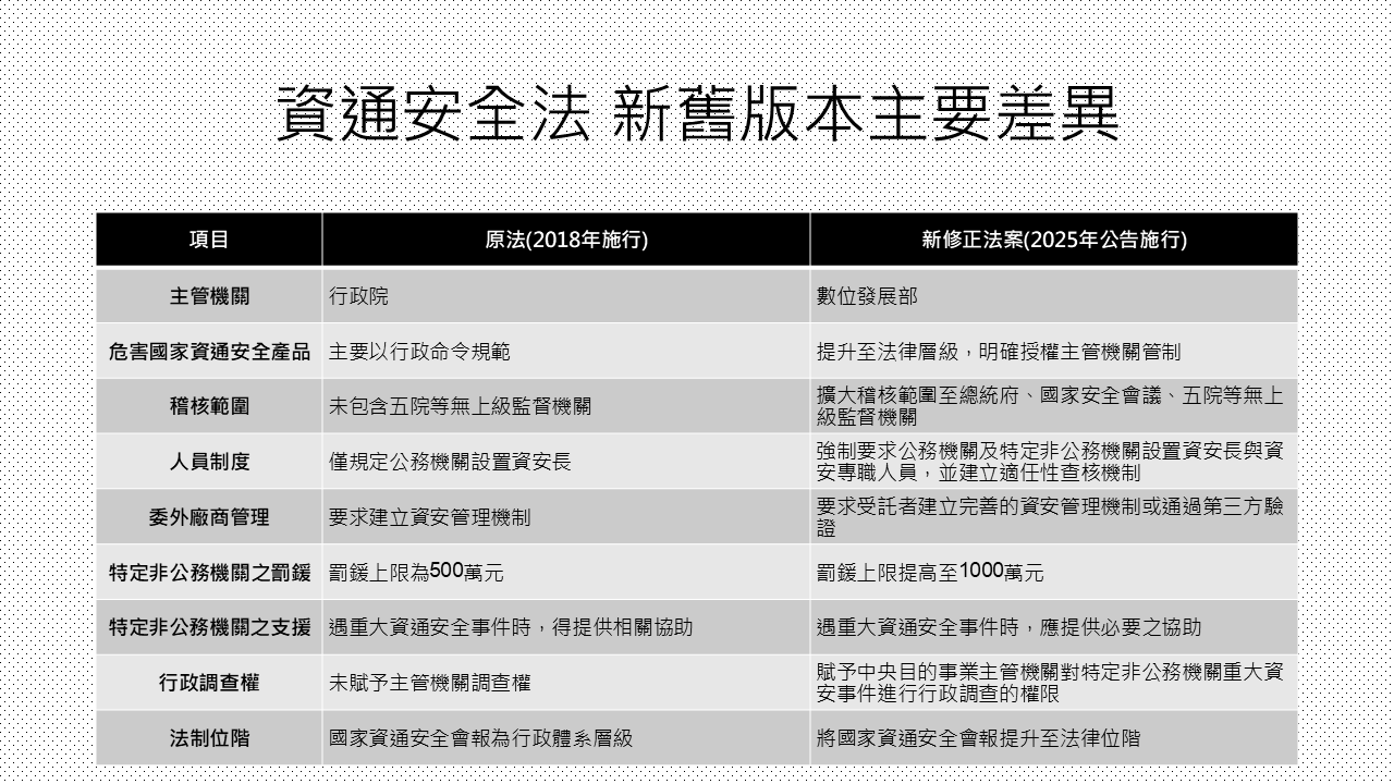 資通安全管理法自2018年6月6日公布並於2019年1月1日施行以來,已歷經六年餘,本次修正為資通安全管理法自2019年施行以來首次修正。簡單比較資通安全管理法之新舊版本如下…